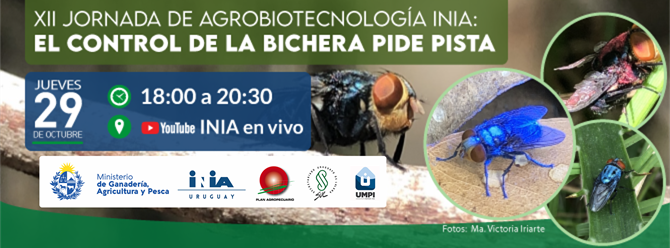 INIA en conjunto con el MGAP, IPA, SUL y UMPI organizan la “XII Jornada de Agrobiotecnología INIA”, que este año tendrá como foco el combate a la mosca de la bichera. El tema de la jornada será “el control de la bichera pide pista”.